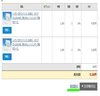・ご注文履歴右下の『領収書発行』をクリック(緑線)